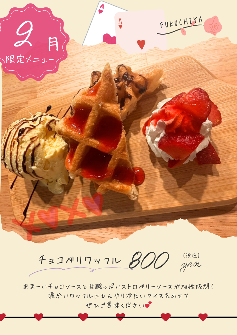 2月限定デザート 2026.02.01 Post Share Hatena LINE RSS feedly Pin it note チョコベリワッフルは初恋をイメージして作りました。 初恋のように甘酸っぱい味、一度食べたら記憶に残る味・・・。 ぜひ一度ご賞味ください。 Post Share Hatena LINE RSS feedly Pin it note