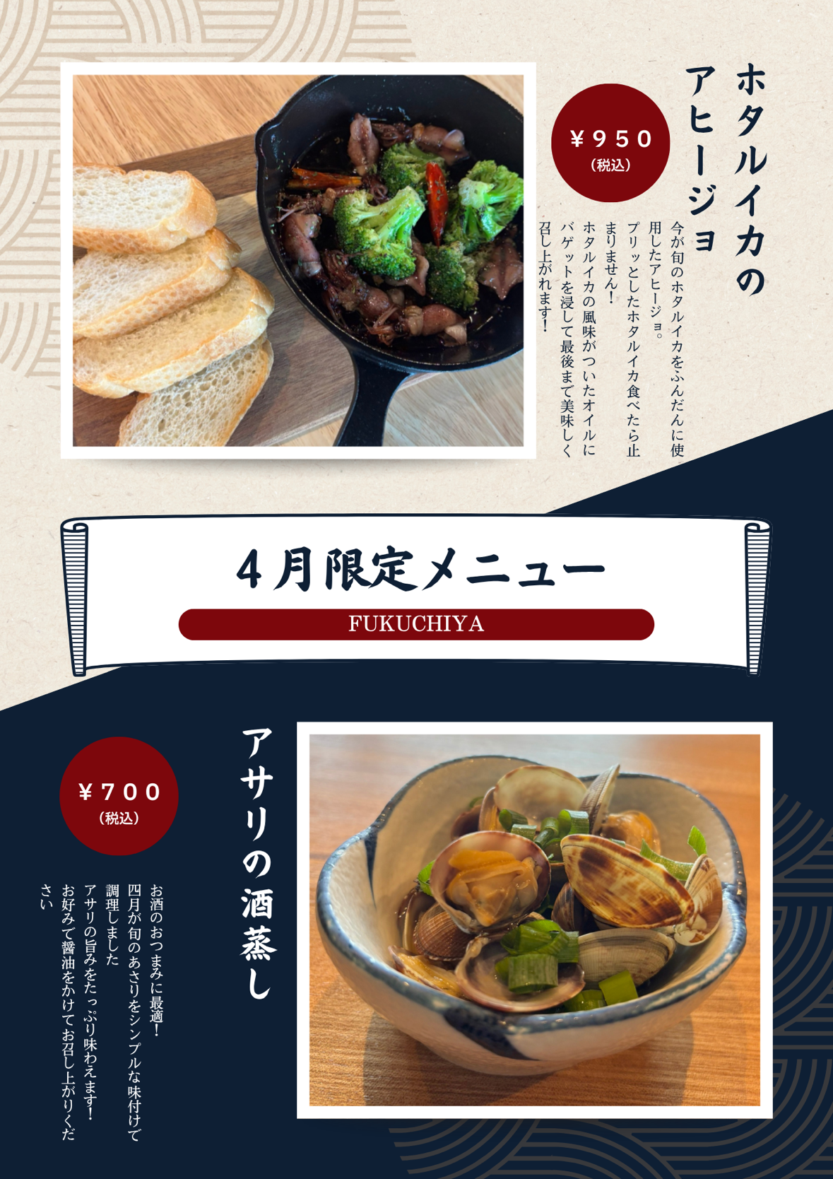 4月限定メニュー 2026.04.01 Post Share Hatena LINE RSS feedly Pin it note 4月限定メニュー2種です! どちらもお酒のおつまみにピッタリ!! ぜひご賞味ください! Post Share Hatena LINE RSS feedly Pin it note